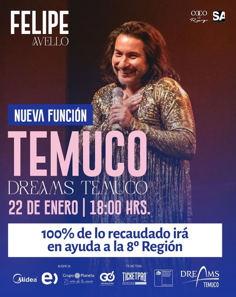 El comediante Felipe Avello anunció un evento en el Hotel y Casino Dreams Temuco en Avenida Alemania 0945. El espectáculo será a beneficio para los afectados de la octava región y se realizará el jueves 22 de enero a las 18:00 horas.