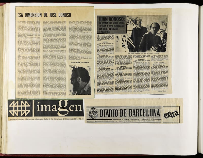 Junto con los diarios, en el Archivo Digital se encuentra un particular objeto catalogado como “Libro Rojo Donoso”. Se trata de un cuaderno en el que, muy ordenadamente, el autor iba acopiando todo lo que se decía de él en los periódicos: los anuncios publicitarios de sus novelas, las críticas, reportajes y entrevistas. Entre otros, podemos ver recortes de diarios españoles, italianos, argentinos, colombianos, venezolanos , mexicanos, chilenos, estadounidenses. Aborda un período de tiempo limitado a la aparición de sus libros El obsceno pájaro de la noche (1970) e Historia personal del Boom (1972).