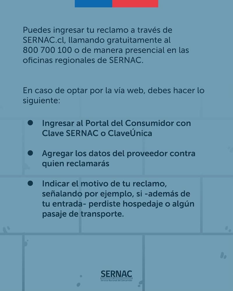 Además, los usuarios puede presentar un reclamo ante el Servicio Nacional del Consumidor (SERNAC). Para ello, debe ingresar al Portal del Consumidor en el sitio web oficial del organismo utilizando su Clave SERNAC o ClaveÚnica. Es necesario completar un formulario con detalles como el monto pagado por las entradas, la cantidad de personas afectadas y los gastos adicionales en los que se haya incurrido, como transporte, alojamiento o alimentación. También, se recomienda adjuntar comprobantes que respalden estos gastos.