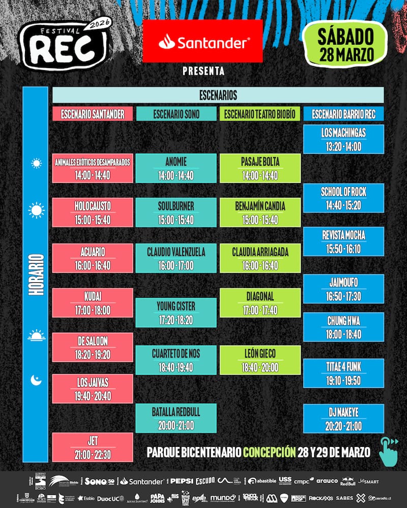 En la Sala Principal de Teatro Biobío se presentarán Nico Ruiz, Nektar Machine, Tu Temple, Chimalguen, Fernando Raín y Bodenos. Mientras que hasta el escenario del Pueblito REC llegarán DJ Atenea, Mr. Funky, Ala Vorágine, Flor de Guayaba, Mr. Pilz y Go Go Gallo Pipe.