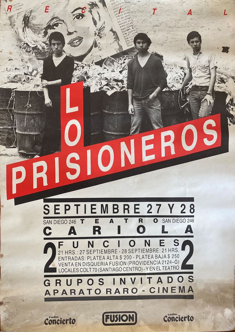 Los shows también alcanzaban colegios del sector oriente de la capital, circuitos asociados a una movida artística de elite y sitios remitidos a movimientos que parecían situarse en las antípodas, como el Café del Cerro, epicentro el canto nuevo. 1985, el año posterior a La voz de los 80, emerge como un largo calendario con los conciertos más disímiles y en los sitios más impensados. Por ejemplo, en la exclusiva discoteca Brass Club del Hotel Crown Plaza, donde estaba sentado Álvaro Corbalán de la CNI entre el público. Apenas vio a Los Prisioneros, se paró y se fue.