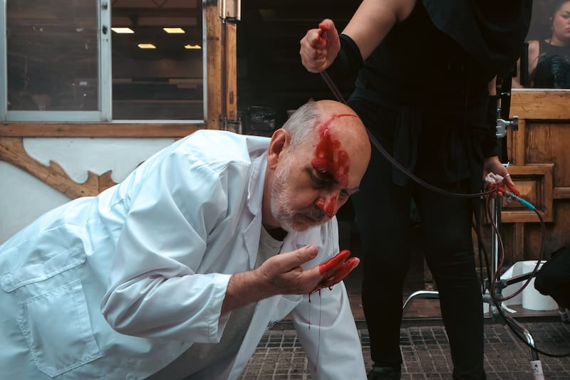 Conversamos mucho la analogía con el samurái con el director Daniel Vivanco. Luca Barella, mi personaje, practica el iaidō (arte marcial relacionado con desenvainar y envainar la espada katana). Al prepararme para la película, tomé muchas clases de iaidō. Tiene que que ver con una postura ética, una especie de centro frente a la violencia y, a la larga, con darle una muerte digna a tu oponente. A través de este arte marcial, mi personaje le encuentra un sentido a una vida que se le está cayendo a pedazos. Luca Barella está realmente al borde y que ve en este estallido su posibilidad redención personal, de salvación. Es capaz de enfrentar al monstruo que está afuera del local y que cobra vida en el personaje de Mirko, interpretado por el gran actor que es Roberto Farías.