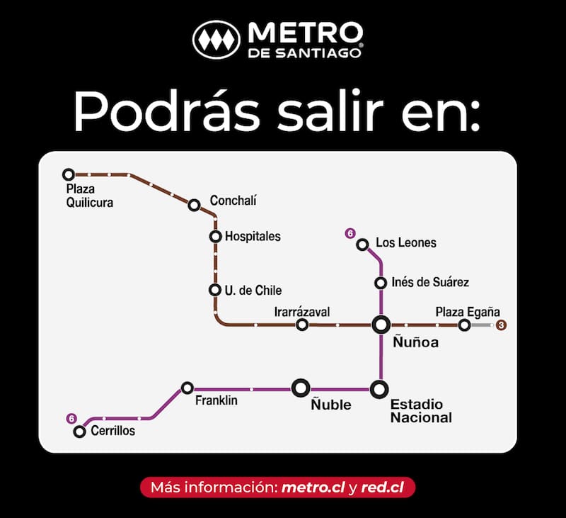 Línea 6: estaciones Los Leones, Inés de Suárez, Ñuñoa, Estadio Nacional, Ñuble, Franklin y Cerrillos.