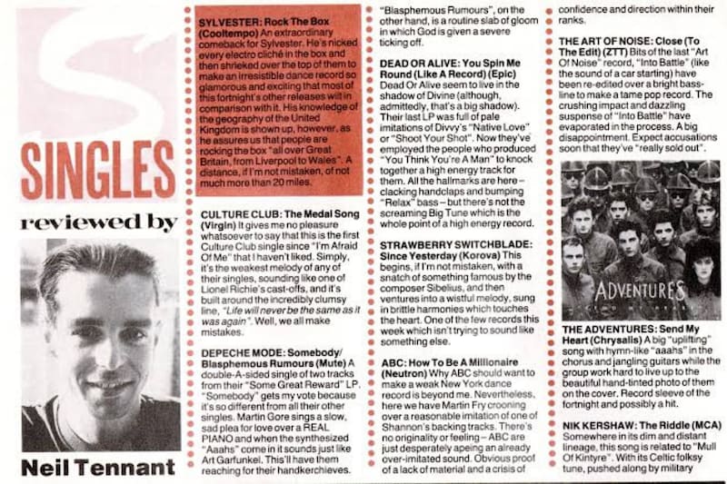 El músico de Pet Shop Boys también entrevistó a los miembros de Depeche Mode, la banda inglesa de música electrónica que tenía pocos años desde su creación en ese entonces. En el diálogo, los miembros del grupo confesaron que, durante un viaje a Berlín, se habían emborrachado en medio de una entrevista local y dejaron que un chico les tomara fotos sin ropa. A la mañana siguiente, al darse cuenta del error, la banda tuvo que rastrear al fotógrafo y comprarle los negativos para asegurarse de que esas fotos jamás se imprimieran.