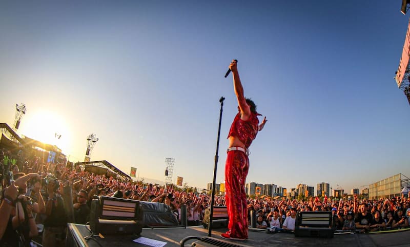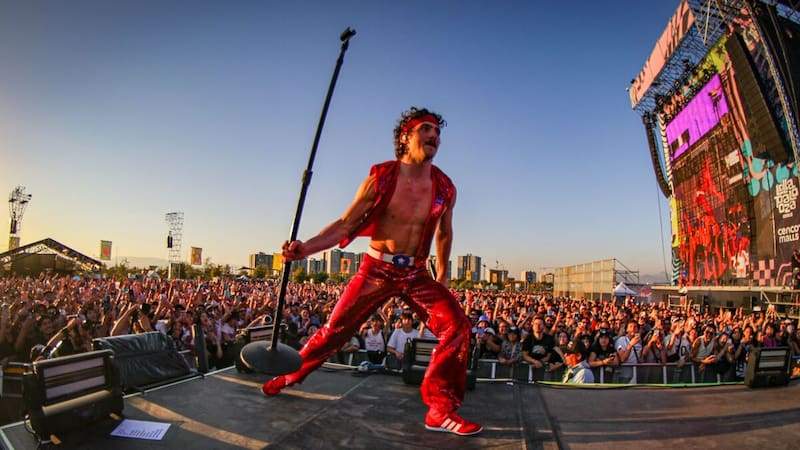 Una banda poco protagonista, también completamente vestida de rojo, lo acompaña en el fondo. Su sola presencia, el brillante traje y la llamativa voz son suficientes para cautivar a más de algún asistente que va pasando por la entrada del Parque cerrillos. Y ya casi cerrando la primera jornada de Lollapalooza Chile, se siente necesario una invitación al baile, a la balada romántica y a la euforia de la juventud; que en gran parte, ya está con la emoción de ver a la headliner que continúa. Esto último lo tiene claro. Nombra a la estadounidense y dice que es un gran fan.