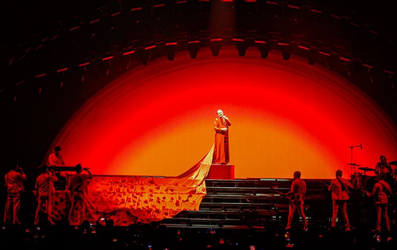 Todo inicia con Mirarte. La banda, completamente vestida de blanco lo acompaña con instrumentos y voces; ocho complementos que se suman a la performance. Caminan coordinados, se detienen al ritmo de la música. Acá todo es coreografía.