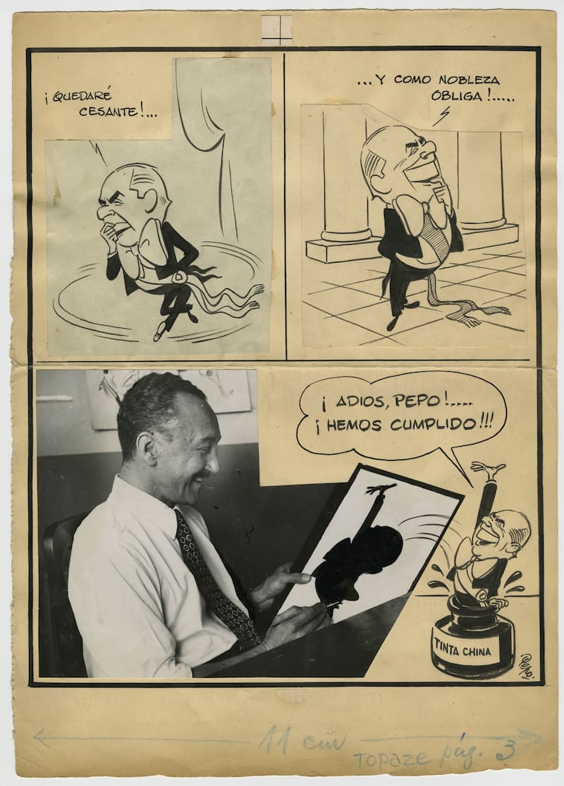 También, casi es deportado a Chiloé por un chiste que hizo sobre el primo de su padre, el presidente Juan Antonio Ríos. “Dibujé en un periódico llamado Saca Pica una caricatura en que aparecía el expresidente con un sofá a cuestas, con una leyenda que decía ‘vendió el sofá’. Sacó tanta pica al exmandatario que se nos procesó, al director, y yo estuve a punto de ser relegado a Chiloé (…) Habría resultado curioso recibir un castigo del ‘pariente’“, cuenta Pepo en su autobiografía.