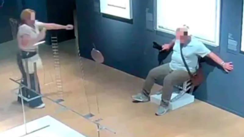 La obra se llama Van Gogh, y era parte de una muestra del artista italiano Nicola Bolla. Al notarla, el hombre se acercó, hizo el ademán de sentarse, pero de pronto perdió el equilibrio y cayó pesadamente sobre la silla. El impacto fue tal, que en el acto se quebraron dos patas y el asiento. La pareja salió rápidamente del lugar, pero ya habían sido detectados por las cámaras de seguridad.