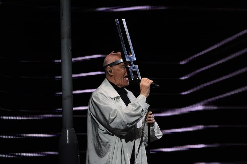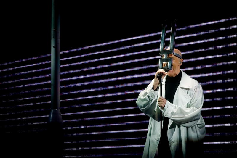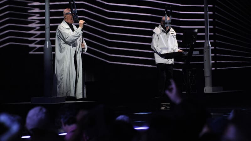 En línea con su Dreamworld Tour, apuesta futurista y tecnológica que llevan presentando en vivo desde 2022, Pet Shop Boys juega simbólicamente con vestuarios, pantallas y luces. Sus máscaras representan su conexión con la música.