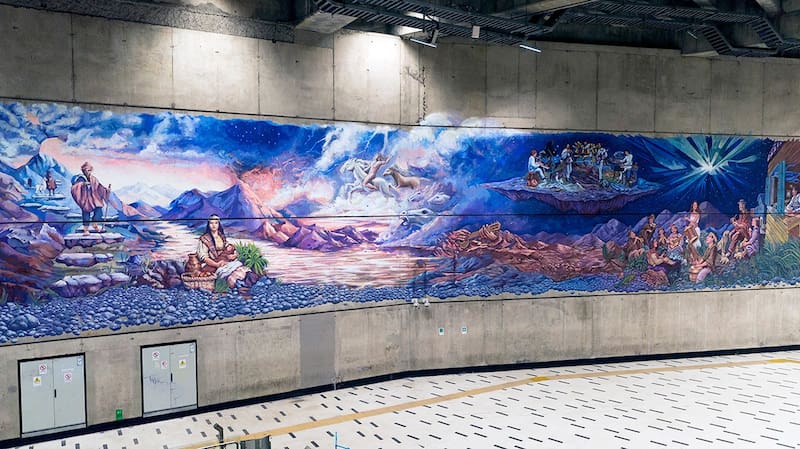 Tal como lo hizo José Venturelli con el mural donde recorrió Chile de mar a cordillera (y que hoy se puede ver en el GAM), Olivares creó una enorme pintura de 30 metros de largo por 6 metros de alto en que homenajeó al río Mapocho, el cual está arriba del metro. Así lo comentó él a la prensa.