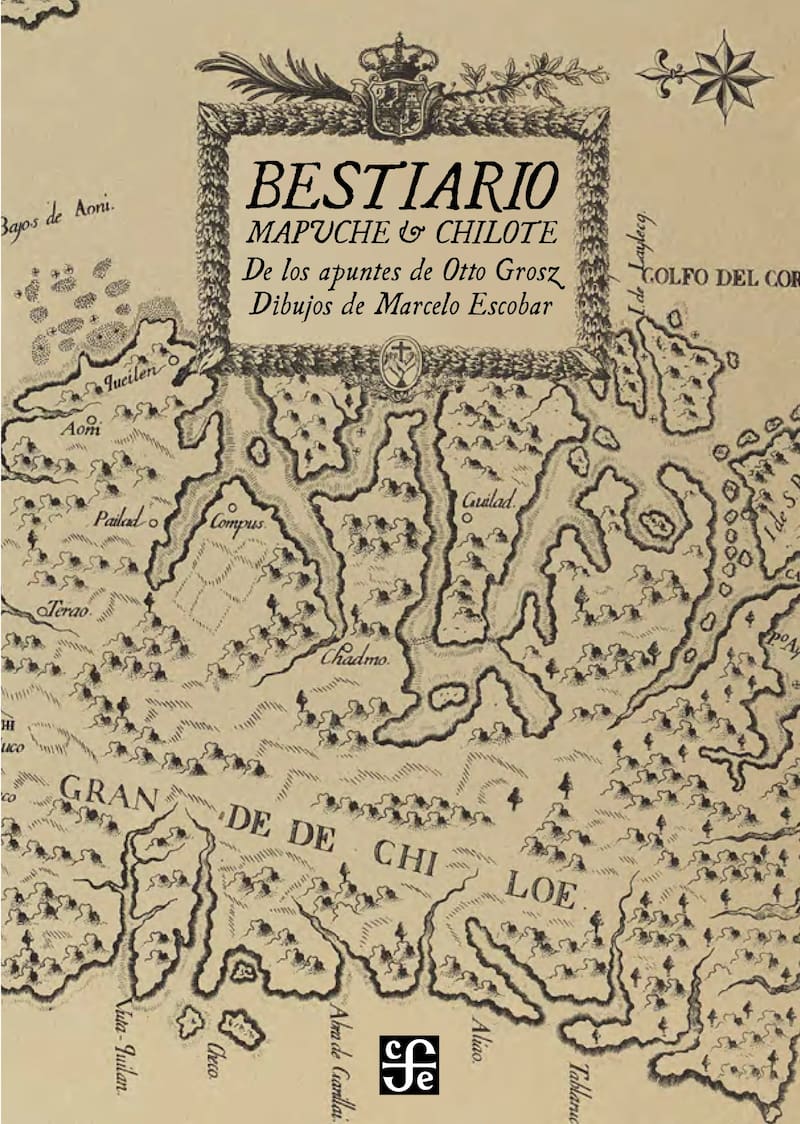En la literatura medieval, los bestiarios eran libros muy populares: suerte de álbumes de zoología simbólica o fantástica donde figuraban leones o caballos junto con basiliscos y dragones. Esa fue la inspiración de Jorge Luis Borges en el Libro de los seres imaginarios. En esa tradición se inscribe este bestiario que recoge personajes y criaturas de la mitología mapuche y chilota. El hilo que guía el libro son los supuestos apuntes del soldado alemán Otto Grosz, quien viajó a Chile en 1890 para cumplir servicio en el gobierno del presidente José Manuel Balmaceda. Fue herido en la Guerra Civil y se recuperó gracias a los cuidados de una lavandera mapuche. Entonces comenzó a registrar estas leyendas orales en un cuaderno que fue hallado un siglo después en una feria de las pulgas de París. El ilustrador Marcelo Escobar da forma a los relatos de Grosz: dibuja en blanco y negro, con los trazos de los mapas antiguos, la lucha entre Kay Kay y Tren Tren Vilú;, machis, duendes como el Kollón, el diablo travieso Meulén, el maligno Ñirrivilu o la niña azul conocida cono Calfú Malén. Y también al Caleuche chilote, la Pincoya, el Camahueto que transporta a los brujos y Pihuchén, la culebra voladora. Un gran despliegue de mitos e imaginería en edición de lujo.