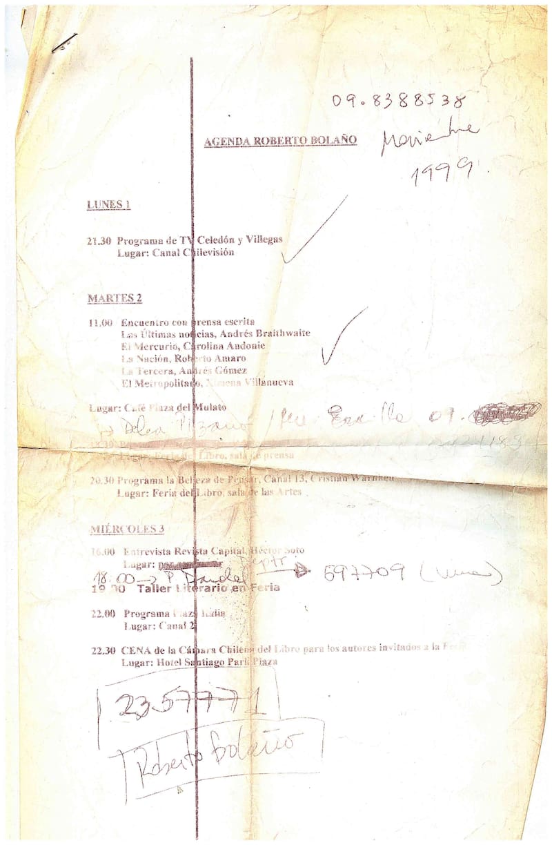 Y así llegó el día. Martes 2 de noviembre de 1999. Segundo día de sus actividades públicas en el país, las que comenzaron en la mañana con una serie de entrevistas para los medios: pasaron LUN, El Mercurio, La Nación, La Tercera y El Metropolitano. Los periodistas fueron citados en el café de la Plaza del Mulato, a contar de las 11.00 de la mañana. El día anterior, Bolaño había estado en Chilevisión, en el programa de Jaime Celedón y Fernando Villegas.