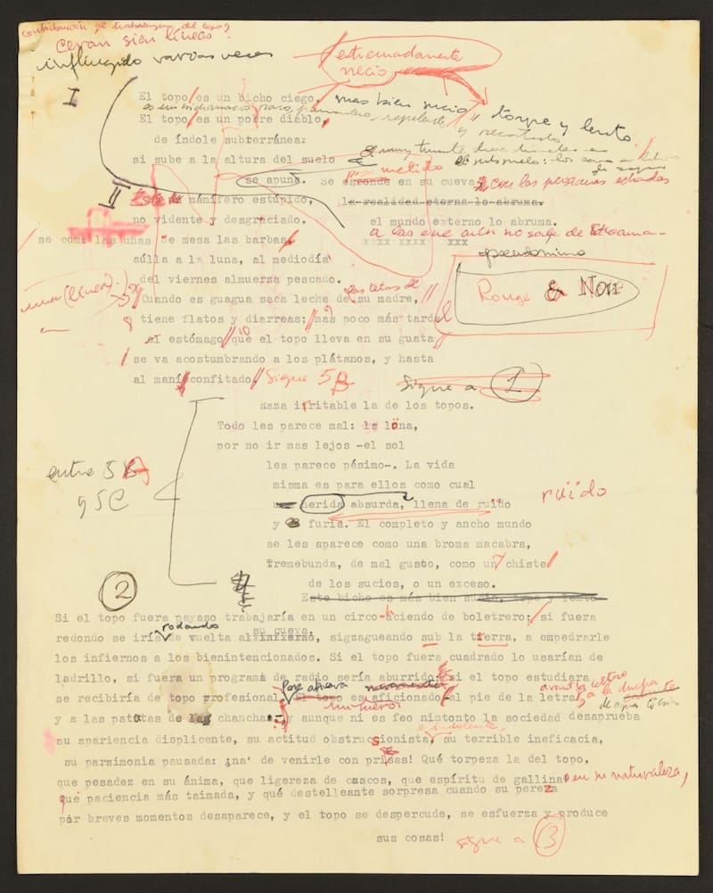 En la mencionada Topología del pobre topo, por ejemplo, escribe: “Tormentoso, el Topo tiembla: tiene tristeza: atrona un poco. / El Topo no tiene comida: dinero tiene tampoco. / Pero tiene taller / Tiene taller: en las tardes talla tornea tañe tararea -atrona un poco".