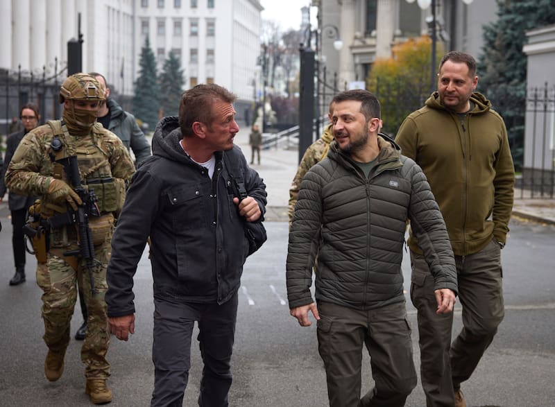 El presidente de Ucrania, Volodymyr Zelensky, publicó una foto de él reuniéndose con el actor en la oficina presidencial en las barricadas dependencias gubernamentales de Kiev. La foto mostraba al presidente vestido de negro hablando con Penn. No hubo detalles inmediatos sobre su conversación.
