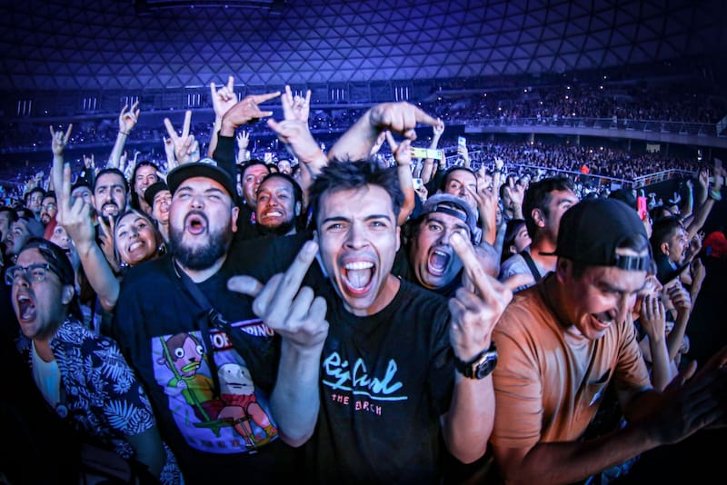 Cuando The Offspring finalmente apareció en el escenario, la euforia del público se hizo sentir de inmediato. La energía de sus fans encontró su contraparte en la potencia de All I Want, la primera canción que interpretaron. Luego siguieron con el clásico Come Out and Play y Want You Bad, desatando la total locura en el Movistar Arena. La escenografía demostraba perfectamente su intención, con calaveras inflables gigantes acompañadas de las gráficas retro de las pantallas.