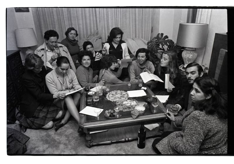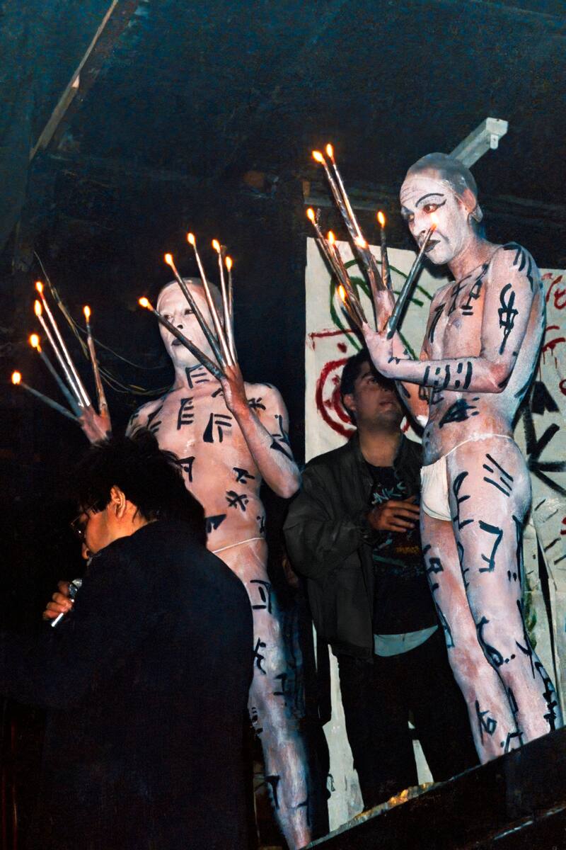 También hay tres capturas de Álvaro Hoppe, fotógrafo que reporteó junto al autor de Perlas y cicatrices para Página Abierta. En una tira de contacto, se aprecia a Las Yeguas del Apocalipsis en una feria del libro de 1991, en Estación Mapocho. En un registro “están las Yeguas y está Sebastián Piñera al que le hacen un quite, no quieren tomarse fotos con él”, apunta Bahamondes. A este grupo se suma la foto que hace de portada de Loca Fuerte, de Óscar Contardo, y un registro donde las “Yeguas están joteándose a unos guardias”, dice el periodista.
