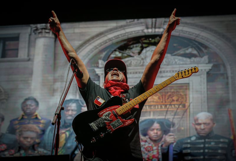 En un momento, Morello dio vuelta su guitarra Telecaster y mostró un mensaje: “No al fascismo”, sí, en castellano, lo que generó aplausos. Es que la impronta del compromiso político está tan presente en Morello que lo demostró esta misma mañana visitando las tumbas de Víctor Jara y del expresidente Salvador Allende.