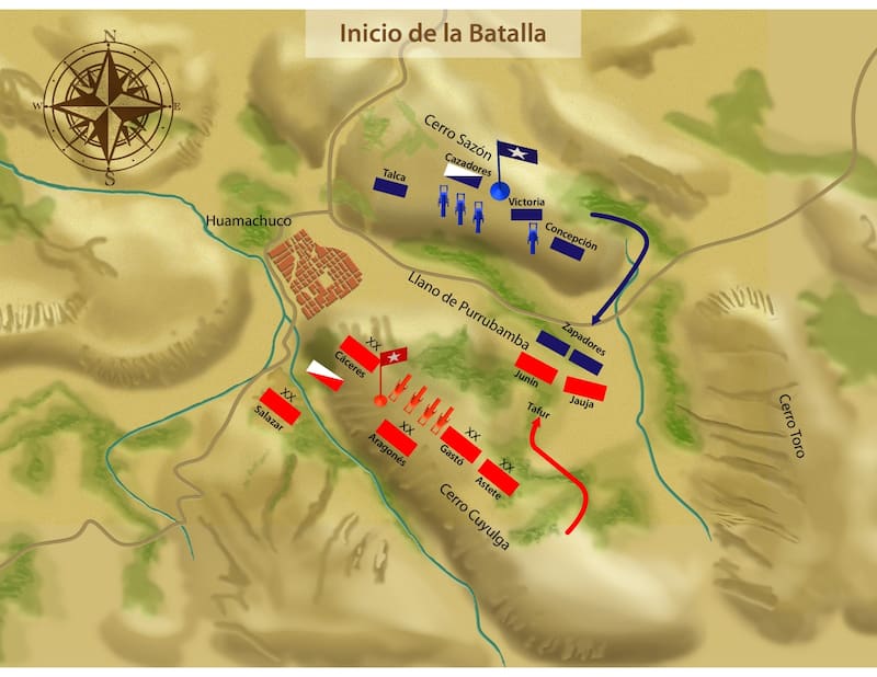 “Al costado sur de Huamachuco se ubica el llano de Purrubamba que está rodeado por el oeste por el Cerro Sazón y por el este por el cerro Cuyulga -relata Mellafe-. Las fuerzas chilenas se encaramaron en el Sazón mientras que las fuerzas irregulares de Cáceres en el Cuyulga. En la mañana del 10 de julio de 1883, bajaron efectivos del Regimiento Zapadores al llano donde se enfrentan con montoneros de Cáceres”.