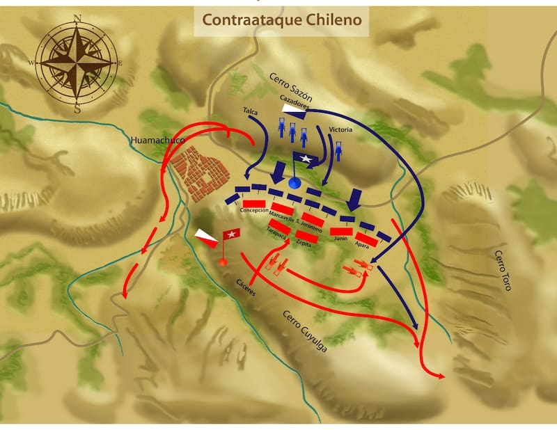 La situación era compleja, si resultaban flanqueados, los chilenos se verían envueltos y sin escapatoria. Sonaron unos gritos y alaridos “¡Viva el Perú!”, los tambores y clarines de su Ejército comenzaron a sonar atronadores. Era cosa de minutos que los peruanos obtuviesen una victoria aplastante que mantendría viva la resistencia de Cáceres.