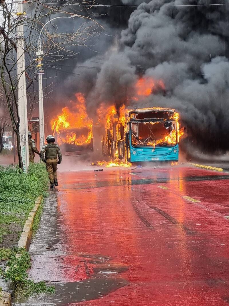 La jornada de este jueves 8 no fue distinta a las anteriores, pues se repitieron los cortes de tránsito, el cierre de 11 estaciones de Metro y también la quema de buses. Este último hecho se registró cerca de las 10.30 horas, en las cercanías del INBA, en la intersección de Patricio Lynch con San Pablo, donde cerca de 30 encapuchados interceptaron dos micros que transitaban hacia el oriente y obligaron a los conductores y pasajeros a descender.