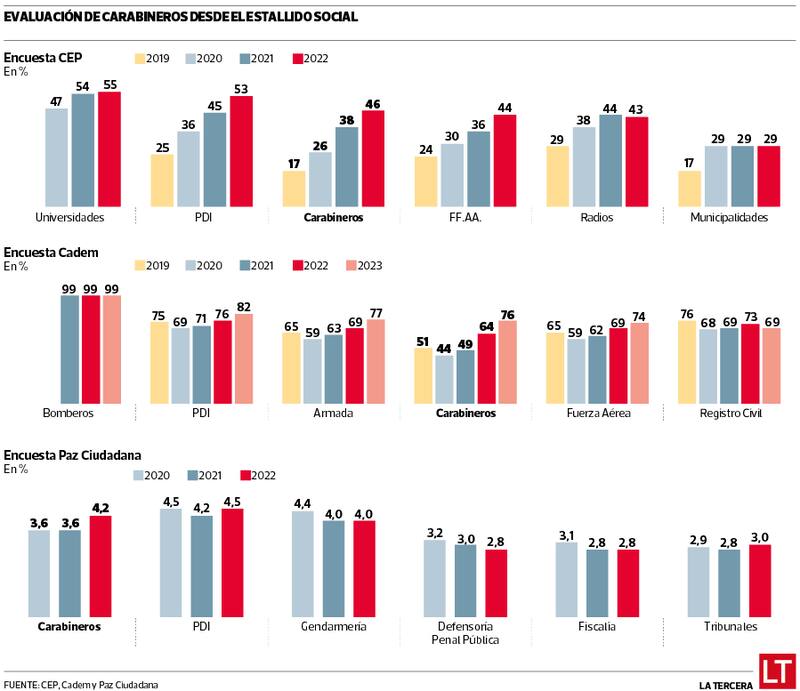 Una de las mediciones que demuestra el incremento que ha tenido Carabineros es la encuesta Cadem de enero -cuando se midió la aprobación de las instituciones-, la cual reveló que el 76% de las personas consultadas aprobaba la labor de la institución. Pero dicha cifra se diferencia bastante de lo ocurrido en las mediciones del 2019, cuando el promedio de aprobación hacia la institución fue del 51%. El resultado más reciente demuestra un incremento del 49% en la evaluación a la policía uniformada. La institución es la que más aumenta, seguida de la Armada, la Fuerza Aérea y la PDI.