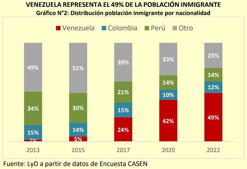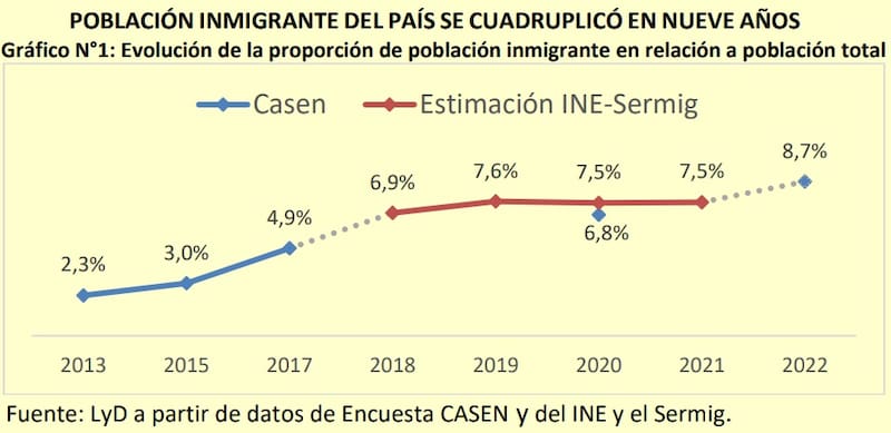 Dado que 2021 no era un año en donde correspondiera realizar la Casen, señalan desde LyD, si se utilizan los datos del Instituto Nacional de Estadísticas (INE), del Servicio de migración (Sermig) y la Casen 2022, se observa un crecimiento de 254 mil inmigrantes entre ambas mediciones. Si bien se utilizan dos fuentes de datos distintas, existe coherencia entre ellas y están en línea con los promedios anuales que reflejan las encuestas de 2020 y 2022.