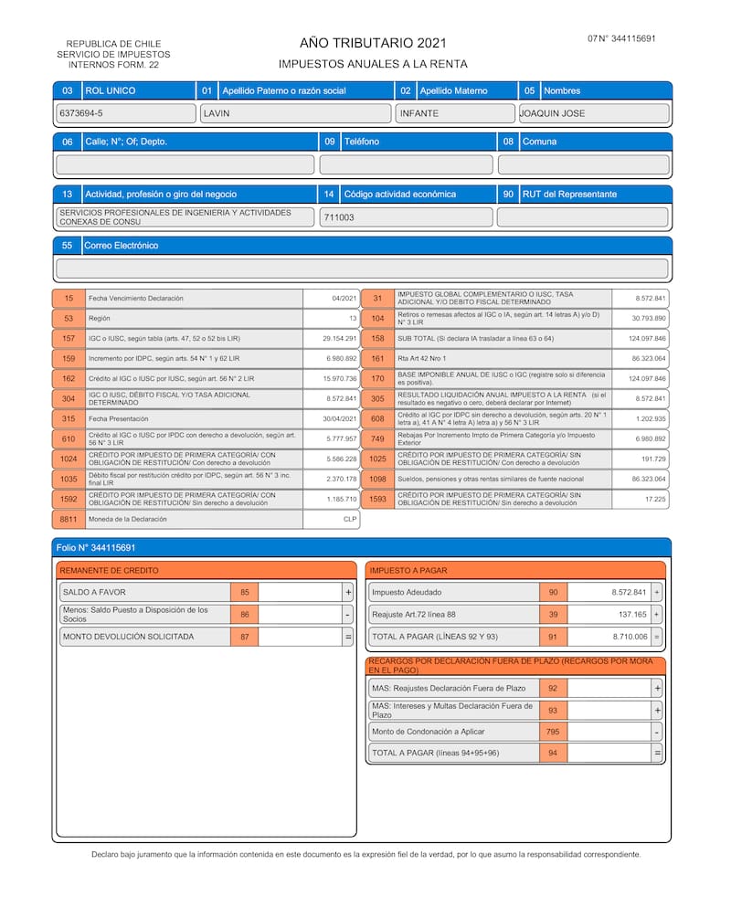 En total en impuestos, el exalcalde de Las Condes pagó más de 29 millones de pesos en impuestos a la renta de segunda categoría y aunque obtuvo rebajas por beneficios tributarios a impuestos de primera categoría por sobre 6 millones 900 mil pesos durante el periodo tributario 2021, en total, al término de la Operación Renta 2021, Lavín debió tributar otros $ 8.710.006 adicionales.