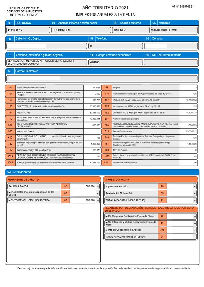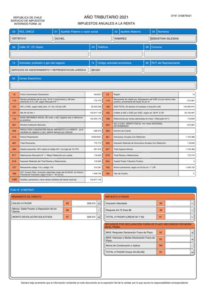 El exministro de Hacienda y actual precandidato presidencial de Evópoli a las primarias de Chile Vamos presentó ante el SII el formulario 22 correspondiente al año tributario 2021 el 24 abril pasado.