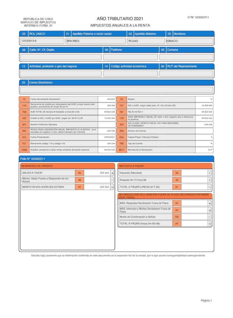 Durante el periodo tributario 2020, en impuesto a las rentas, Briones pagó al fisco $ 19.303.403, una cifra superior al cálculo de su base imponible, por lo que el Servicio e Impuestos Internos determinó que le correspondía una devolución de $ 334.594.