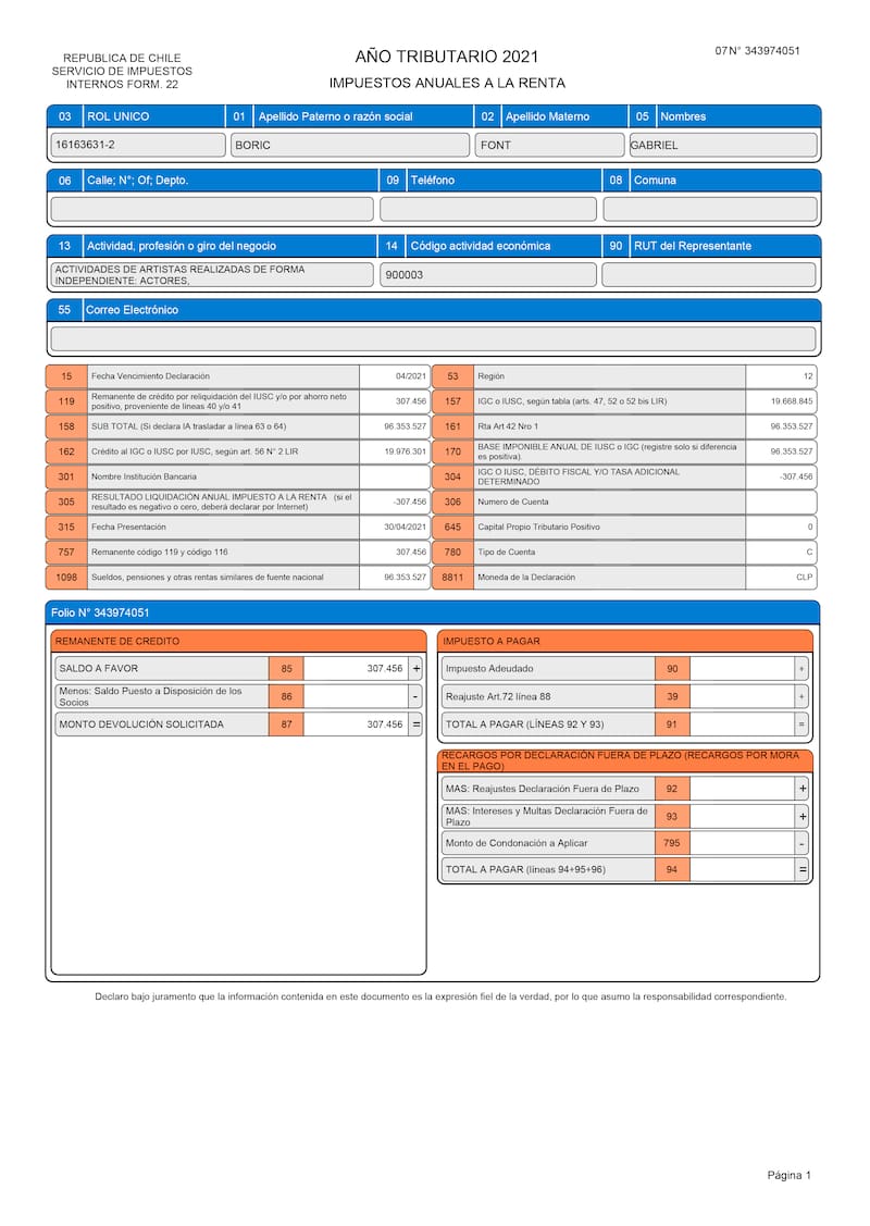 En total, Boric pagó $ 19.668.845 en impuestos a la renta y tuvo una devolución por parte del fisco de $ 307.456 tras el cálculo de su base imponible.