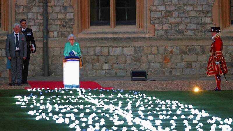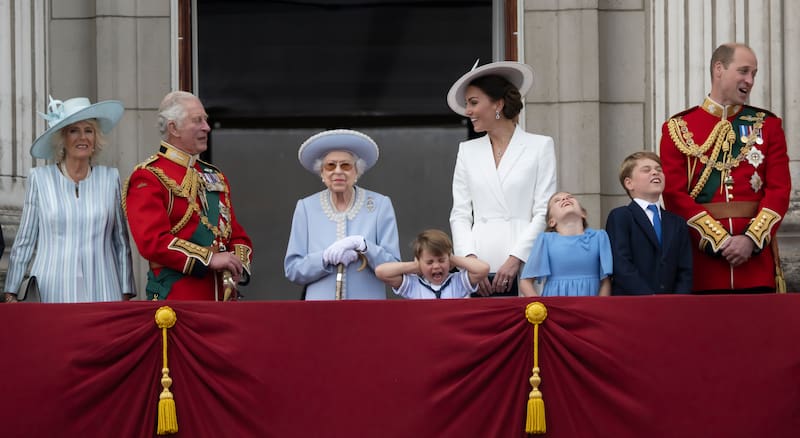 Con un vestido azul grisáceo claro diseñado por Angela Kelly, la reina estuvo acompañada en el balcón por más de una decena de miembros de la realeza, aunque no estuvieron el príncipe Harry y su esposa Meghan, quienes renunciaron a sus deberes reales hace dos años. La pareja viajó a Londres desde su residencia en California con sus dos hijos pequeños para participar de manera discreta en las celebraciones, y vio el desfile del jueves con otros miembros de la familia.