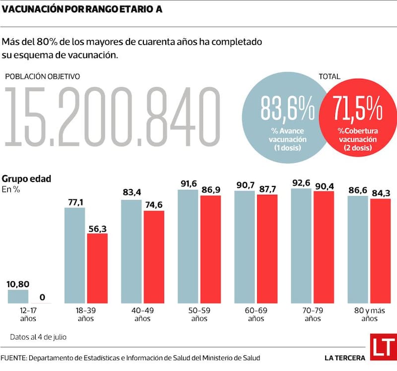 Al desglosar los grupos, los datos evidencian que la respuesta de la población a la campaña ha comenzado a emparejarse. El rango de entre 40 y 49 años, que hasta hace unas semanas se estaba quedando atrás, ya se puso al día. Según los datos del Minsal, más de un 83,4% de la población de esa edad ya se inoculó una dosis, en tanto que el 74,6% completó el esquema.