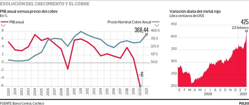 Aún así, añade que ya ajustó sus proyecciones a un crecimiento de 5,5% por el proceso de vacunación y el “relativamente” buen cierre de 2020 por el Imacec de diciembre. “No obstante lo anterior, el alza del cobre podría sumar un par de décimas, pero no es lo más relevante, aunque ayuda. También mejora el ánimo y las expectativas, pero su impacto real de corto plazo, insisto, es menor, incluso para el Fisco”.