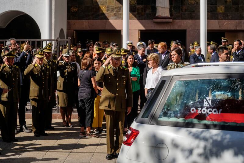 Con los expresidentes y Gabriel Boric dentro de la iglesia llegó el cotejo fúnebre a las 14.08 horas, con un cajón cubierto por la bandera chilena. Lo precedió un grupo de motoristas de Carabineros, con las luces rojas tintineantes, todos con sus uniformes. Los funerales del cabo Palma se realizarán este viernes en Rancagua.