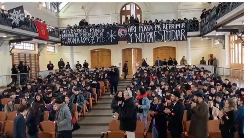 El salón fue decorado por dos lienzos. Uno alusivo a la consigna “Hay plata para reprimir y no para estudiar” y otro dedicado a Claudia López, fallecida en 1998 tras recibir un disparo de Carabineros en medio de una protesta del 11 de septiembre.