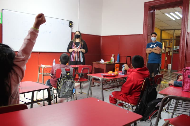 Las preguntas son las mismas y abundan, y las clases no han cambiado, como antes. Las diferencias parecen estar más en el cómo llevar adelante la presencialidad en que si se hace con efectividad. Con los recursos de cada quien, mientras en el Huelén pueden recibir a toda su matrícula al mismo tiempo, en Las Américas Modernas han debido alternar a sus cursos entre días y horarios (mañana y tarde) para acogerlos a todos. Pero aún así encuentran similitudes: ambos tienen salas de ‘rebase’, donde llevan a alumnos en caso de superar los aforos de un aula en particular.