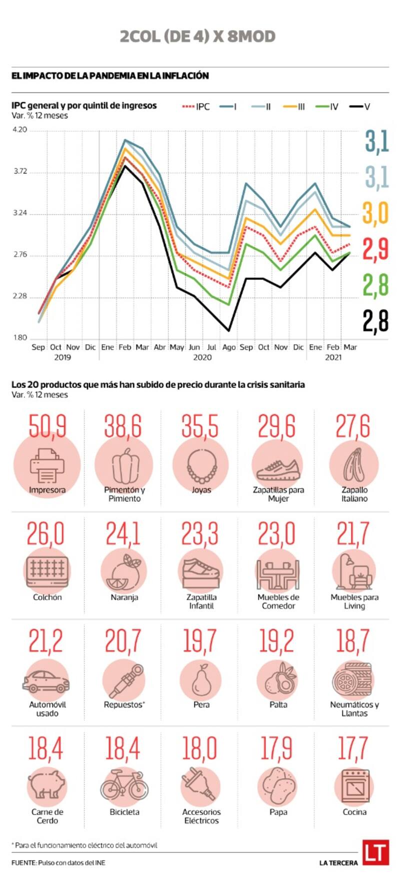 Según los datos del IPC, el bien que más subió de precio en el primer año de la pandemia, es decir, entre marzo de 2020 y marzo de 2021, son las impresoras, con un alza de 50,9%, lo que se condice con el auge obligado del teletrabajo y de la educación remota. Entre los 20 productos con mayores incrementos en los últimos doce meses, además de algunos alimentos como pimentones, naranjas, peras y paltas, aparecen también joyas, con un incremento de 35,5%, y zapatillas, tanto para mujer (29,6%) como infantiles (23,3%).