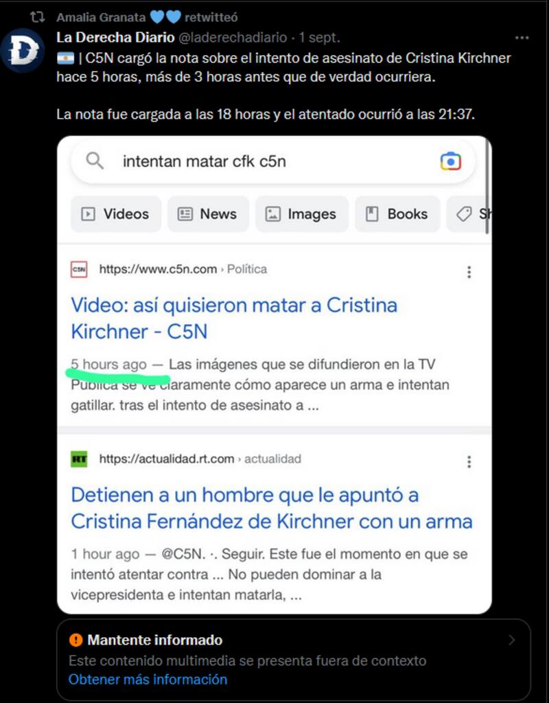 La primera de las noticias falsas, y quizás una de las más famosas, es el supuesto montaje del ataque en base a que C5N, canal televisivo trasandino, habría subido la nota del incidente tres horas antes de que este ocurriera. La noticia la compartió La Derecha Diario, uno de los “pseudomedios” a los que Público se refiere, quienes afirman en una nota que aún está disponible en Twitter, que todo se trataría de un engaño para beneficiar políticamente al gobierno argentino.