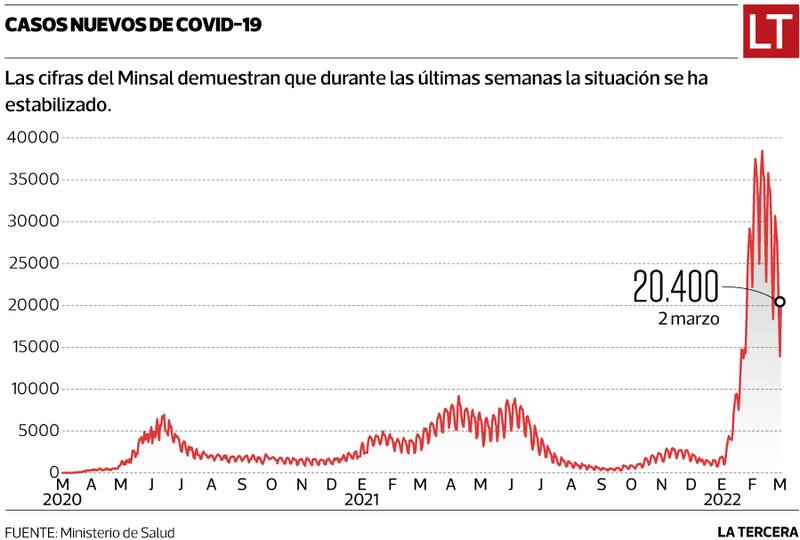 A inicios de enero los casos aumentaron de forma explosiva, superando los peaks más altos de olas anteriores. La curva siguió al alza hasta el 11 de febrero, cuando el Ministerio de Salud informó 38.446 contagios, lo que se mantiene hasta hoy como el récord de transmisiones diarias. Y al día siguiente -según las mediciones del Minsal- comenzó el descenso, que se sostiene hasta ahora.