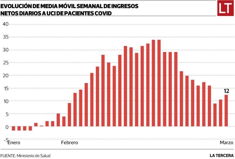 El reporte de Redes Asistenciales da cuenta de una eventual estabilización de los ingresos a unidades de alta complejidad. Mientras a mitad de enero la media móvil semanal de ingresos diarios a UCI de pacientes Covid llegó a 34, el indicador descendió hasta marcar 12 este lunes (ver gráfico).