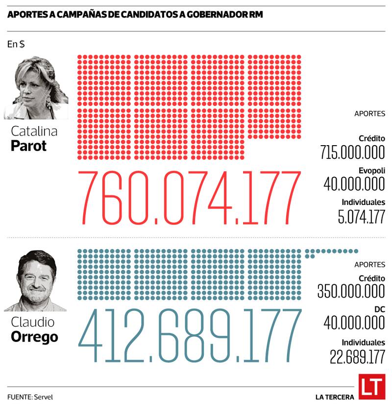 En el caso de Parot, la mayor parte del dinero que está invirtiendo en su postulación proviene de un crédito por $ 715 millones y de un aporte de su partido, Evópoli por $ 40 millones.