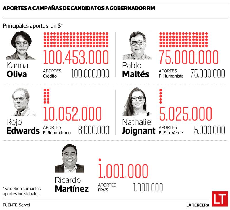 Según la información entregada por el Servel, hasta el viernes de la semana pasada los candidatos a este cargo sumaban aportes por $ 1.364 millones, de los cuales la exministra representa casi la mitad, con $ 760 millones, seguida por Claudio Orrego del pacto Unidad Constituyente con $ 412 millones.