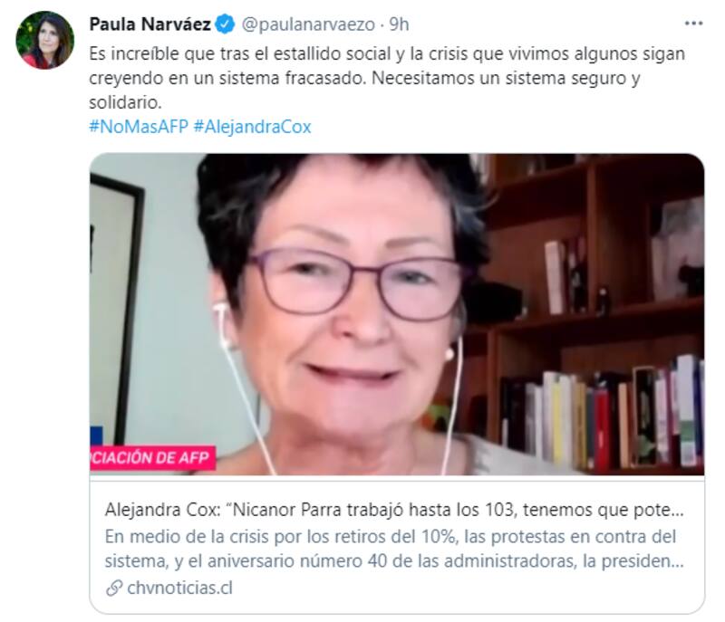A la exministra se sumaron los dichos de Ximena Rincón, carta presidencial de la DC, quien citó al anti poeta y señaló a través de la misma red social lo siguiente: “Alejandra Cox, también Nicanor Parra dijo ‘si hay dos panes y usted se come 2 y yo ninguno, en promedio comimos un pan por persona’. Citas más, citas menos, lo que hay son pensiones miserables que no se arreglarán subiendo la edad de jubilación”.