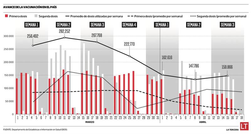Según los datos del Departamento de Estadísticas de Información en Salud (DEIS), si a mediados de marzo se logró -en promedio semanal- inocular 112.899 primeras dosis por día, durante la semana recién pasada solo se inyectaron 51.338 dosis en cada jornada. Estos números representan una caída en la velocidad de inoculación de un 54%.