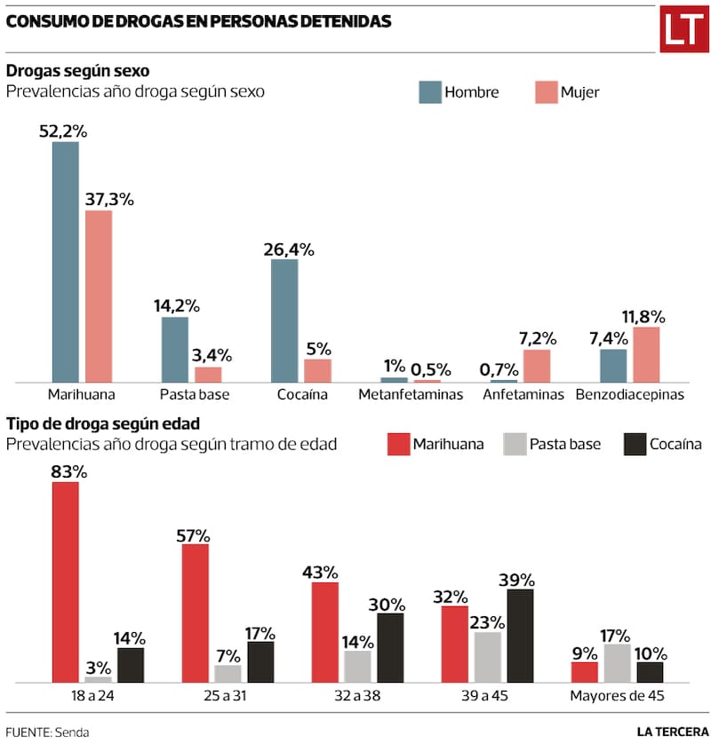 Si en términos generales el mayor uso de drogas se da en los hombres, estos tienen un amplio margen con las mujeres en el uso de marihuana, pasta base, cocaína y metanfetaminas. Situación que se revierte completamente en el caso de las anfetaminas y benzodiacepinas, que son consumidas mayormente por este segundo grupo (ver infografía).