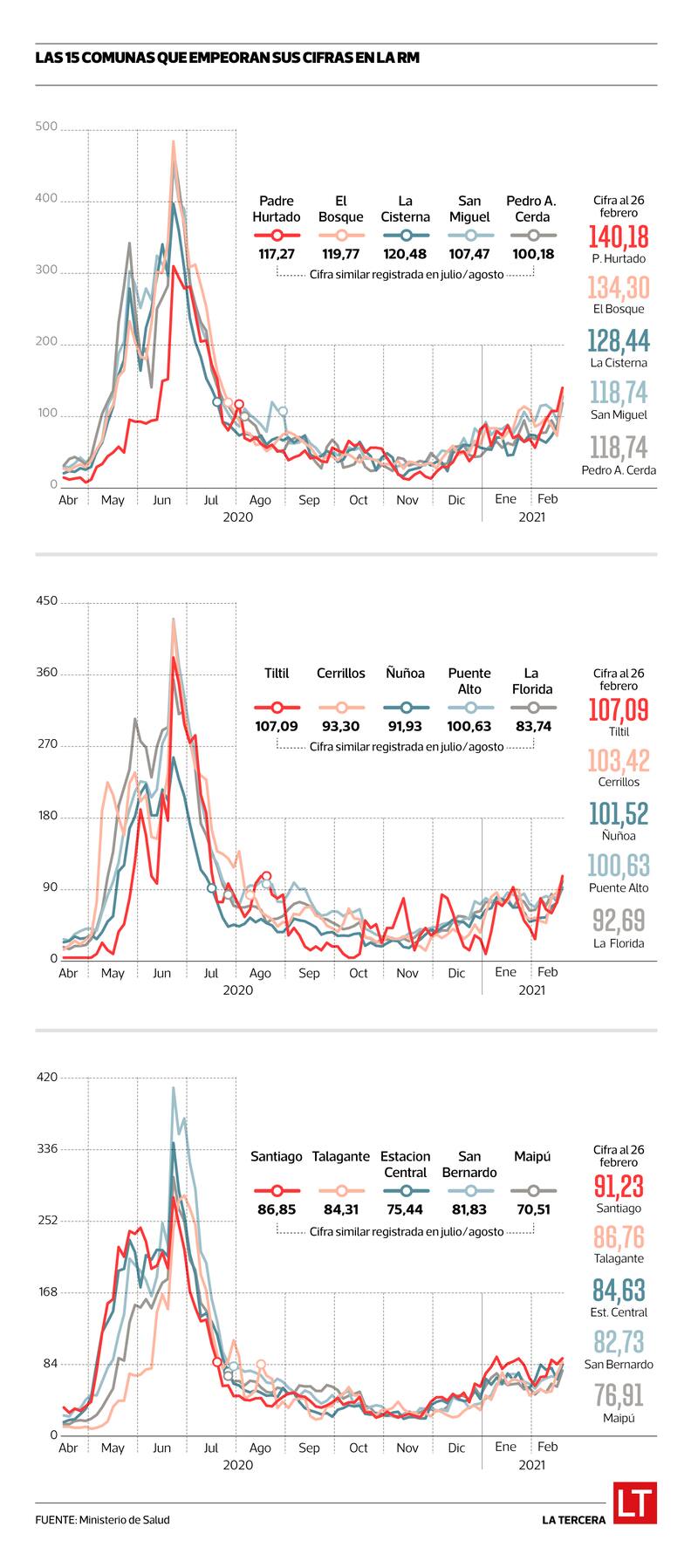 En la lista se encuentran seis de los siete municipios que retrocederán hoy a la fase de Transición, reinstalando las cuarentenas de fin de semana, como Ñuñoa, Estación Central y Puente Alto. Expertos advierten que la pandemia se encuentra en expansión en el país, pero principalmente en la capital, donde los contagios crecieron 18% en las últimas dos semanas.
