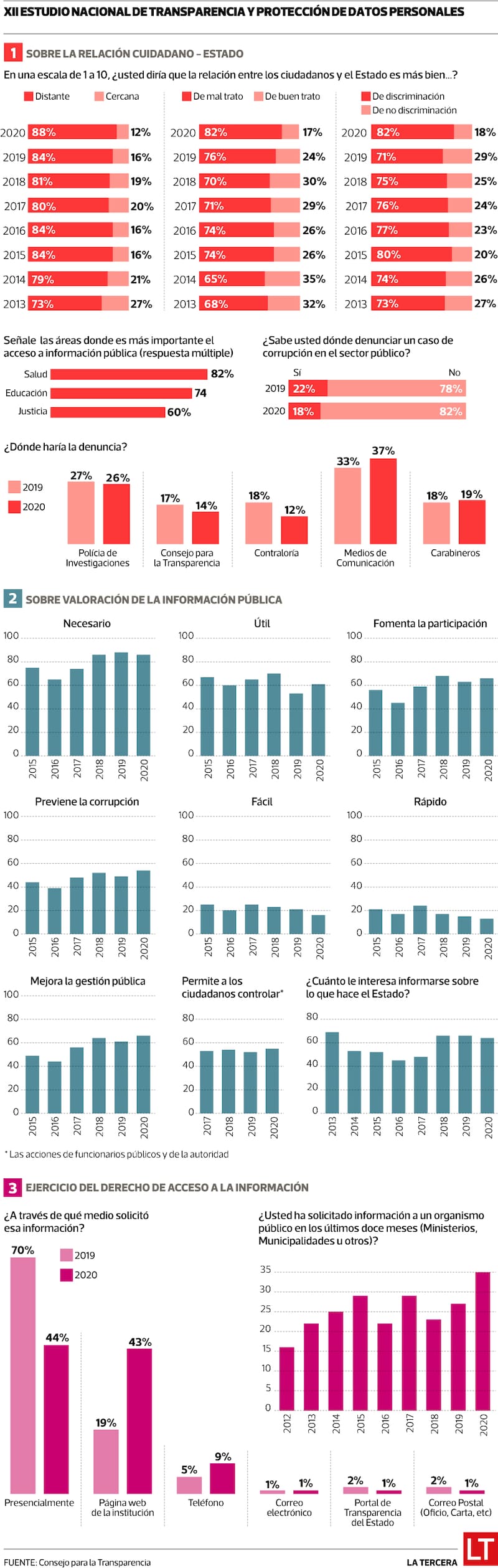 Encuesta del Consejo para la Transparencia mostró que el 88% de las personas estima que su relación con el aparato estatal es distante, 82% de mal trato y 82% de discriminación, niveles históricos desde el inicio de la medición, en 2013. “Estamos con los niveles en rojo”, sostiene la presidenta del CPLT, Gloria de la Fuente, quien advierte que la crisis de confianza se ha profundizado. Los datos demuestran, además, que se mantiene una alta valoración al acceso a la información pública.