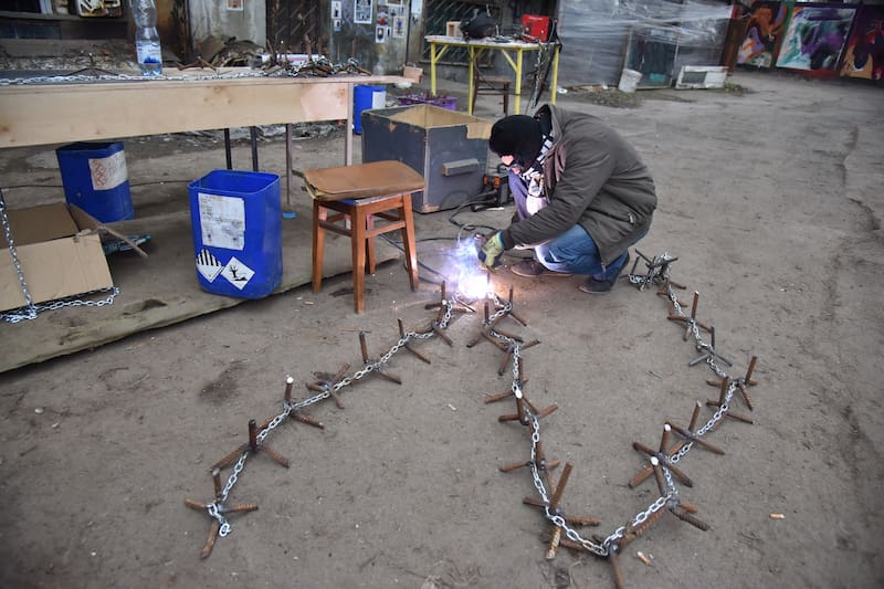 Uno de ellos, Dmitro Zahlyuskyi, de 24 años, dijo que dejó a su madre y a sus dos hermanos en el cruce fronterizo de Polonia a principios de la semana pasada y regresó a Lviv, donde todos los días ha estado ayudando a tejer redes de camuflaje cerca del ayuntamiento con otros voluntarios.