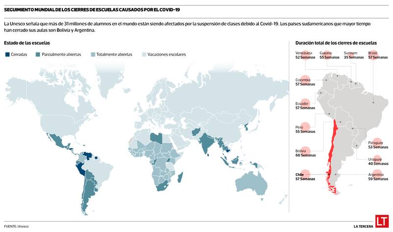 Al menos 31 millones de escolares siguen siendo afectados en el mundo por cierres de establecimientos educacionales debido a la pandemia de Covid-19. De acuerdo con el monitoreo realizado por la Organización de las Naciones Unidas para la Educación, la Ciencia y la Cultura (Unesco), de los ocho países que aún permanecen con sus escuelas totalmente cerradas, tres están en Sudamérica -Perú, Venezuela y Surinam-, y la región es la que mayor tiempo registra fuera de los colegios, con más de 50 semanas consecutivas. Los organismos internacionales urgen a los gobiernos a reabrir las aulas, mientras algunos prefieren avanzar en la vacunación para retomar gradualmente las actividades.