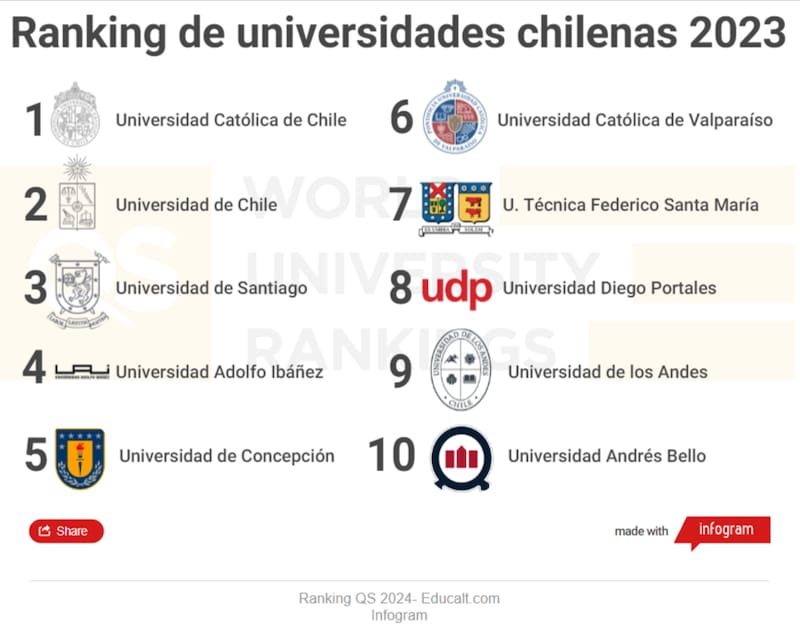 De esta manera, entre las mejores universidades chilenas se encuentran la U. Católica, la U. de Chile, la U. de Santiago de Chile, la U. Adolfo Ibáñez y la U. de Concepción, entre otras.